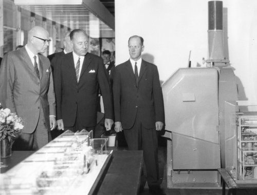 Vasemmalla presidentti Urho Kekkonen, keskellä johtaja Ingvar Blomqvist, oikealla johtaja Risto Tiitola.