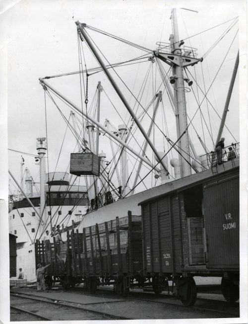 Konepajan tuotantoa lastataan Kotkan satamassa 1950-luvulla.
