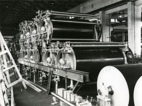 Karhulan sotakorvauspaperikoneen kuivausosa (PK:n kuivaosa) kokoonpantavana konepajalla (sotakorvaus) 15.7.1950.