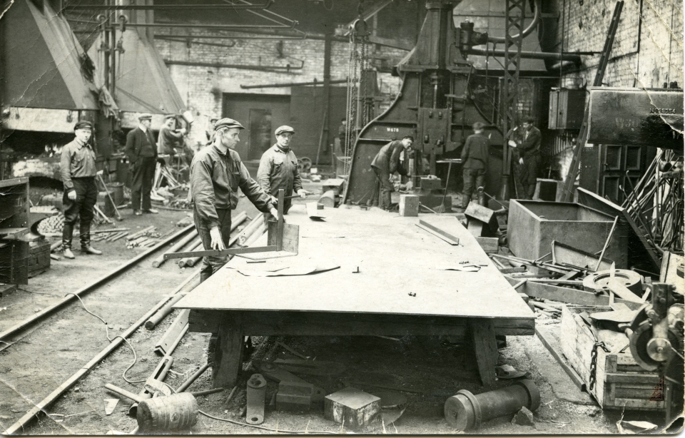 Vasemmalla toimitusjohtaja Kalle Nieminen ja Vallu Grönberg. Odessi-levysepät Mäkinen ja Väinö Hynninen.