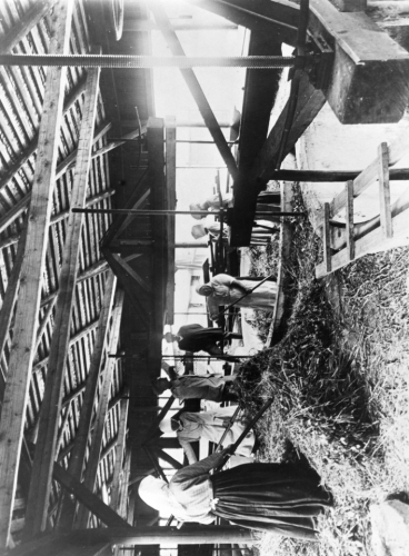 Karhulan Hovin lehmien talviruokintaa varten puristettiin apilaa ja heinää. Keskellä rouva Paasonen ja vasemmalla rouva Sivula.