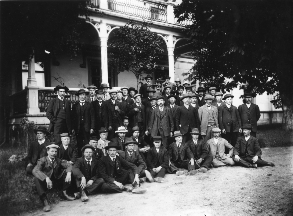 Sahanomistajia ja pienviljelijöitä Ruthin vieraana Hovissa. Isännät ovat kuvassa taaimmaisina.