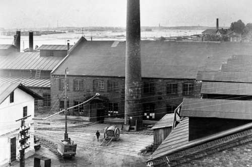 Horisontista, Karhulan konepajan kattojen takaa voi juuri ja juuri havaita Kotkan silhuetin. Tämä hetki jäi kuvaan yli kaksikymmentä vuotta sitten.