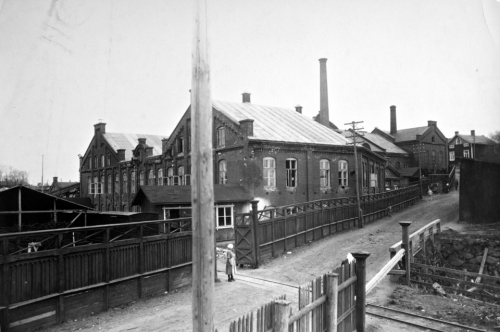 Pois juoksevan miehen peräänkö "Ronttosen" portilla seisova tyttö katsoo. Korkeakosken tehdasaluetta kiersi 1920-luvulla komea aita.